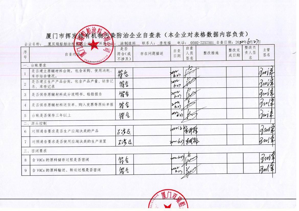 揮發性有機物污染防治企業自查表2022年2第季(廈門雙瑞船舶涂料有限公司)